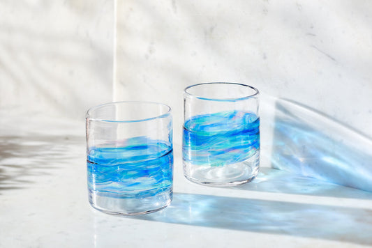Our signature Aurora glassware is made by wrapping a hot band of colored glass around the body of the piece, creating beautiful, one-of-a-kind striations in each carefully curated mix of colors.