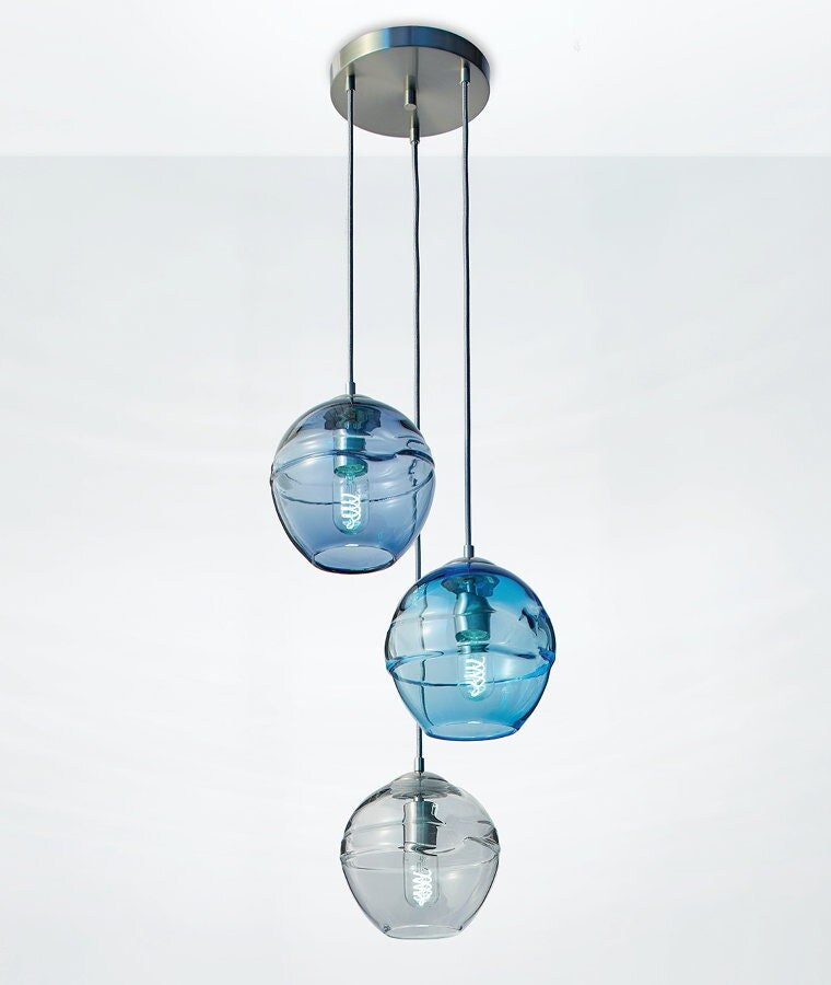 Unique Design: This cascading chandelier is carefully curated with your choice of 3 or 5 hand-blown diffusers in our Fiona style, where a thick band of hot, clear glass is stretched around the body of each globe.