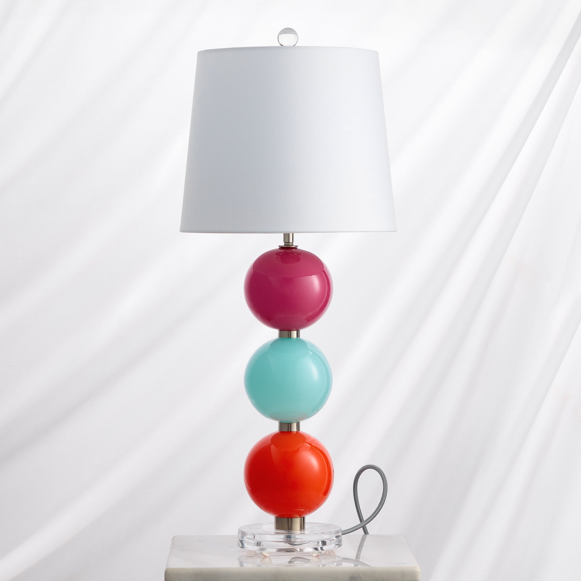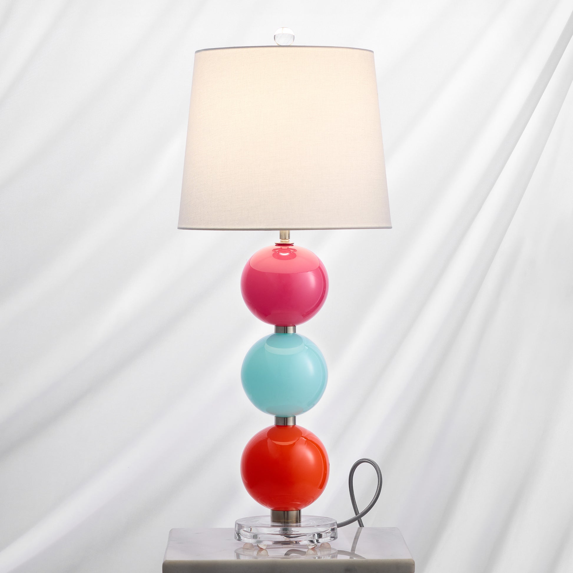 Bring a vibrant pop of color into your home with the striking Nina Table Lamp. Featuring three stacked glass globes, this lamp is perfect for adding a bold touch to your decor. The sleek silver textile cord and three-setting dimmer switch offer both style and versatility to complement any room.