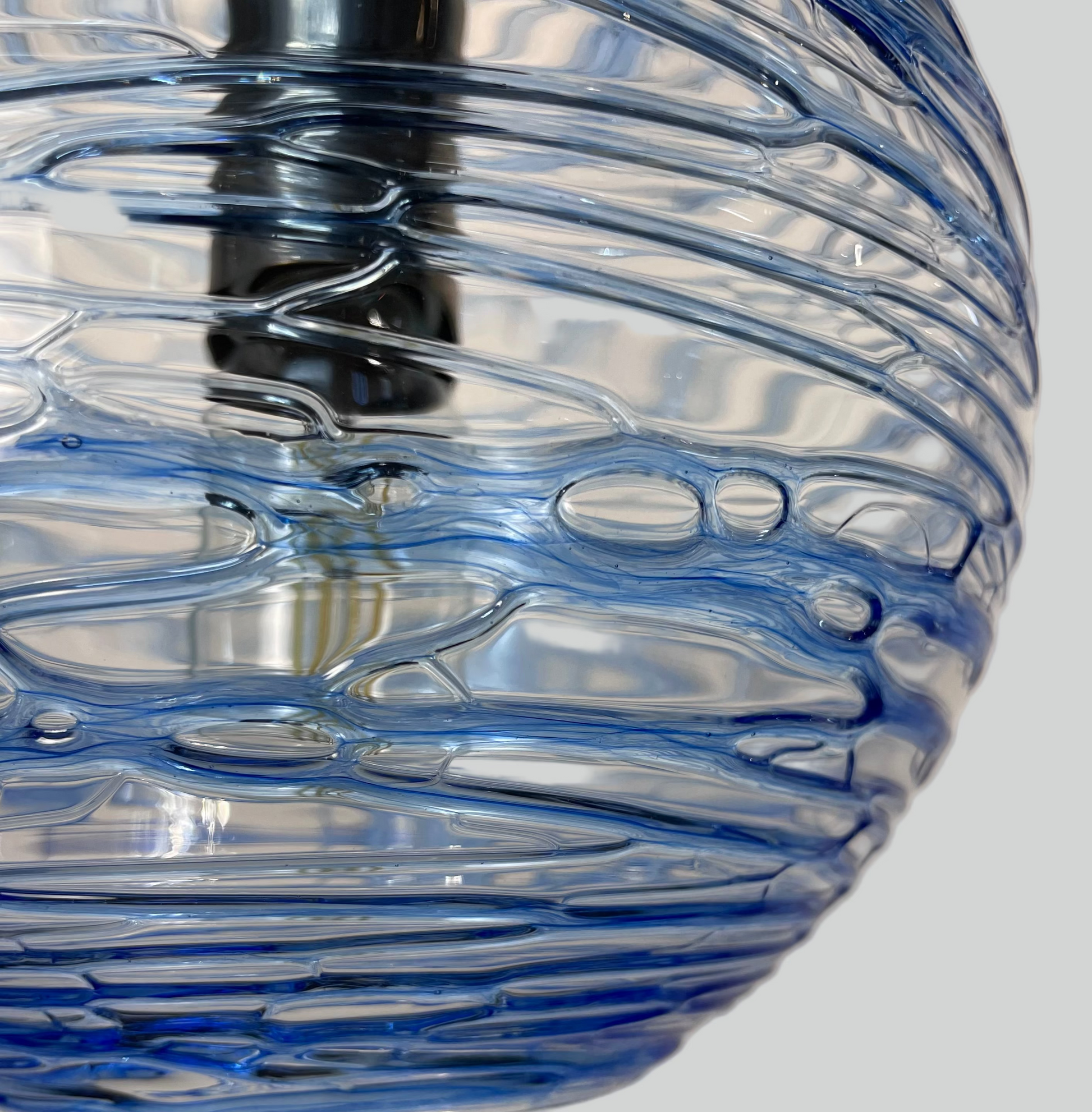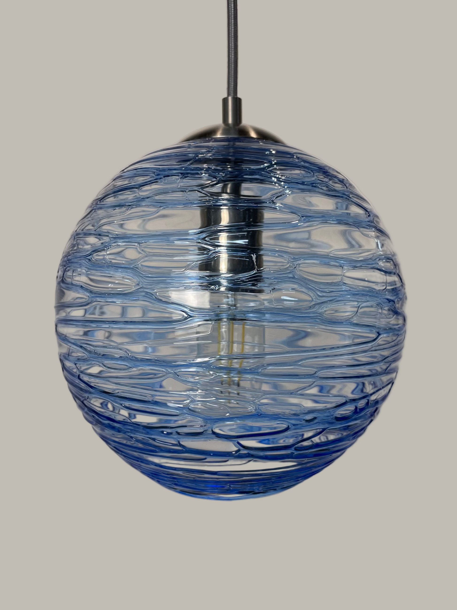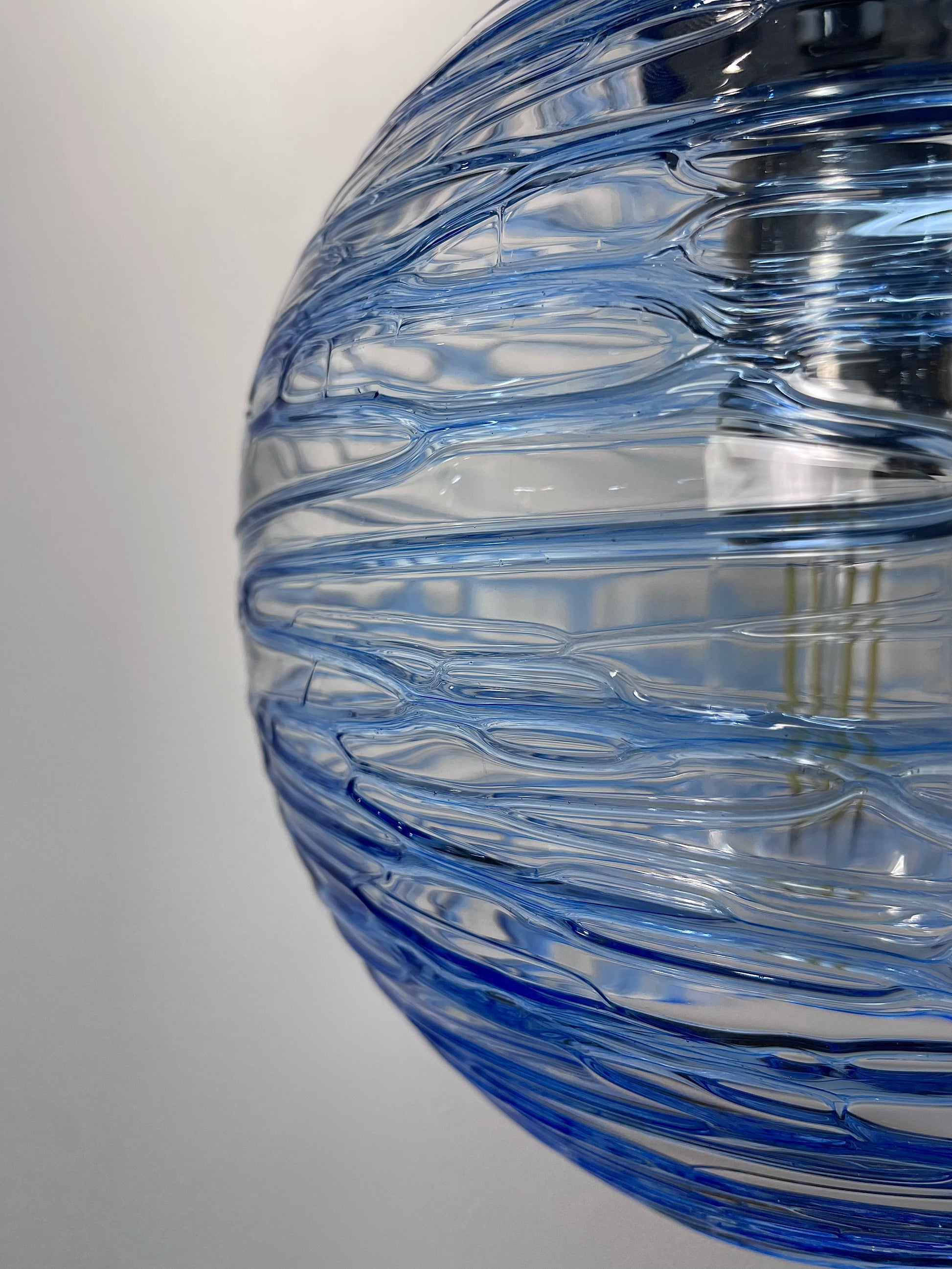 Brighten your home with this blue spun pendant light! In this iteration of our Stella diffuser, the clear shade is wrapped in a sapphire glass, creating a beautiful texture and light effect.