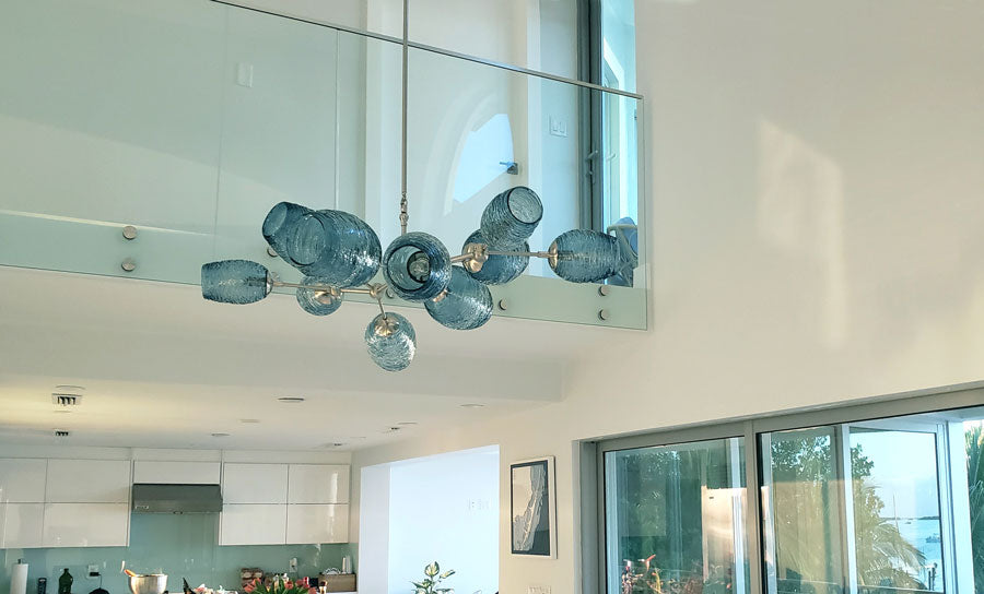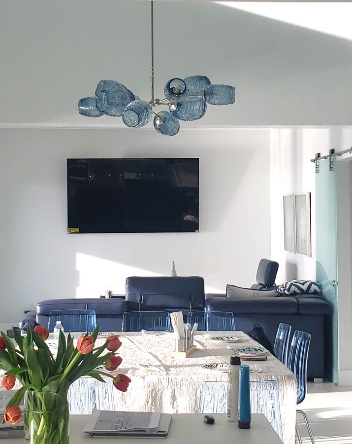 The Santina Chandelier is a bold centerpiece designed to transform dining rooms, living rooms, or entryways. Its carefully balanced frame is adorned with Stella glass diffusers, each one handblown with spun trails of molten glass that capture and reflect light beautifully. The Santina offers full customization in glass color, diffuser sizes, hardware finish, and drop height—so you can create a chandelier tailored to your home.